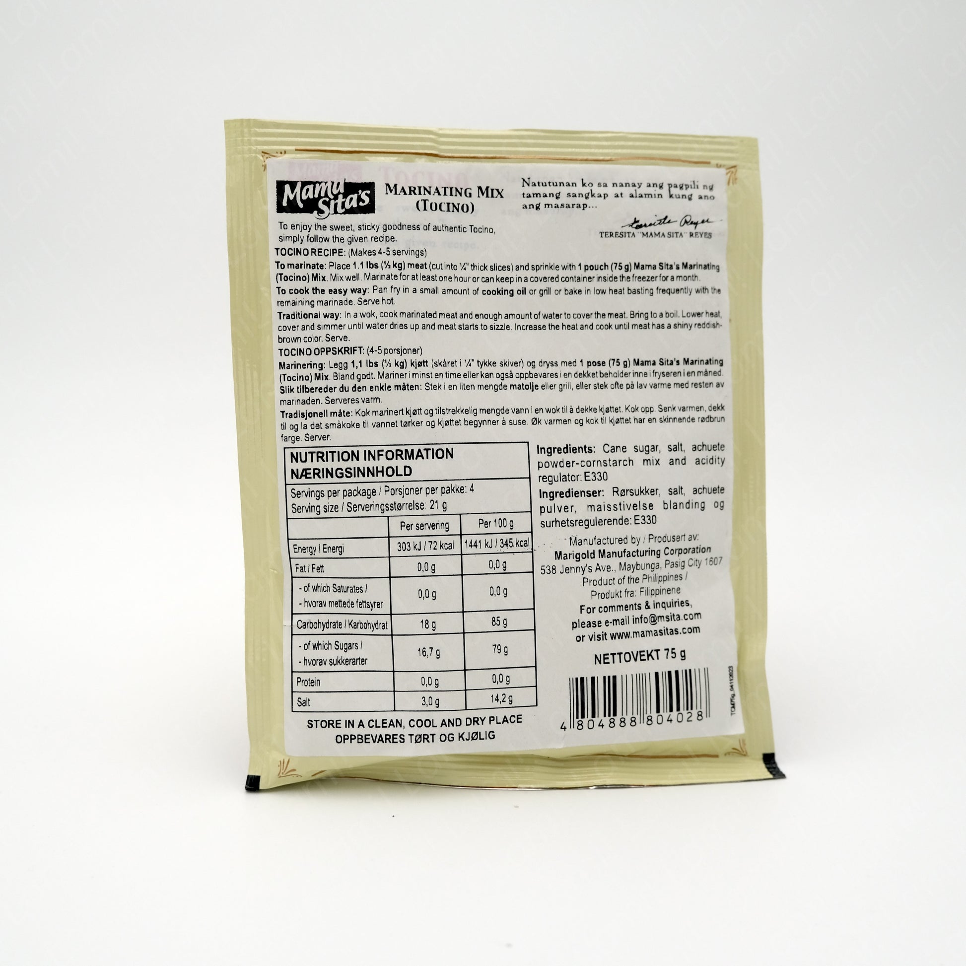 Make sweet, savory, and tender Filipino-style cured meat with ease using MAMA SITA’S Tocino Mix. Specially crafted with the perfect balance of sugar, garlic, and select spices, this mix brings the authentic taste of classic tocino straight to your kitchen. Just marinate your pork, chicken, or beef—then pan-fry to golden perfection!